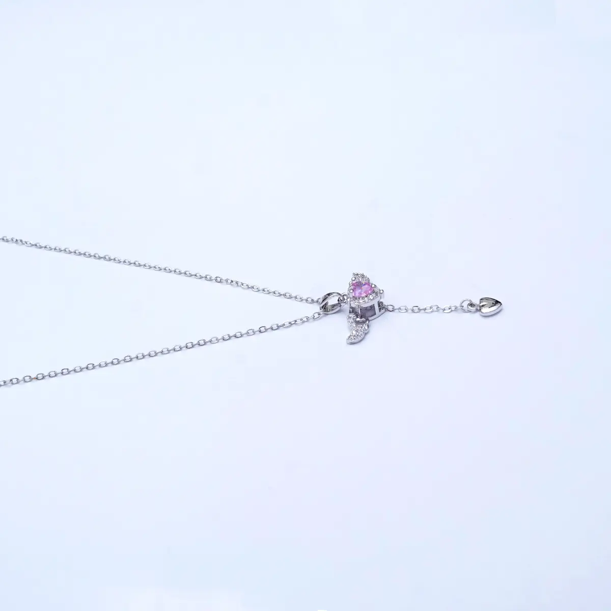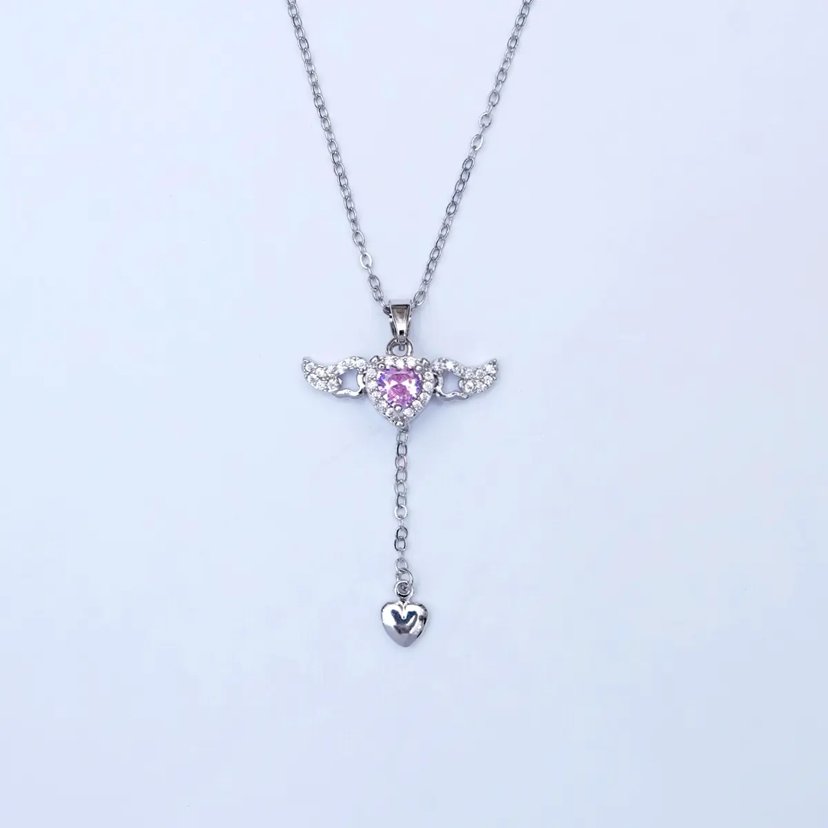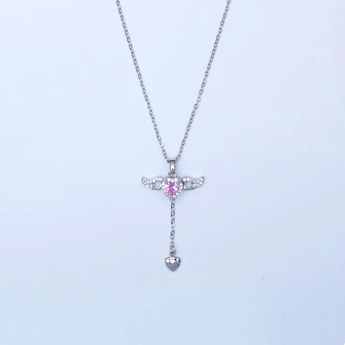 This enchanting necklace features a stunning angel wings design, beautifully adorned with sparkling crystals and a radiant pink heart-shaped centerpiece. The delicate chain complements the intricate pendant, which also includes a smaller heart charm dangling below. A perfect symbol of love and protection, this necklace adds a touch of elegance and whimsy to any outfit, making it an ideal gift for someone special or a lovely treat for yourself.