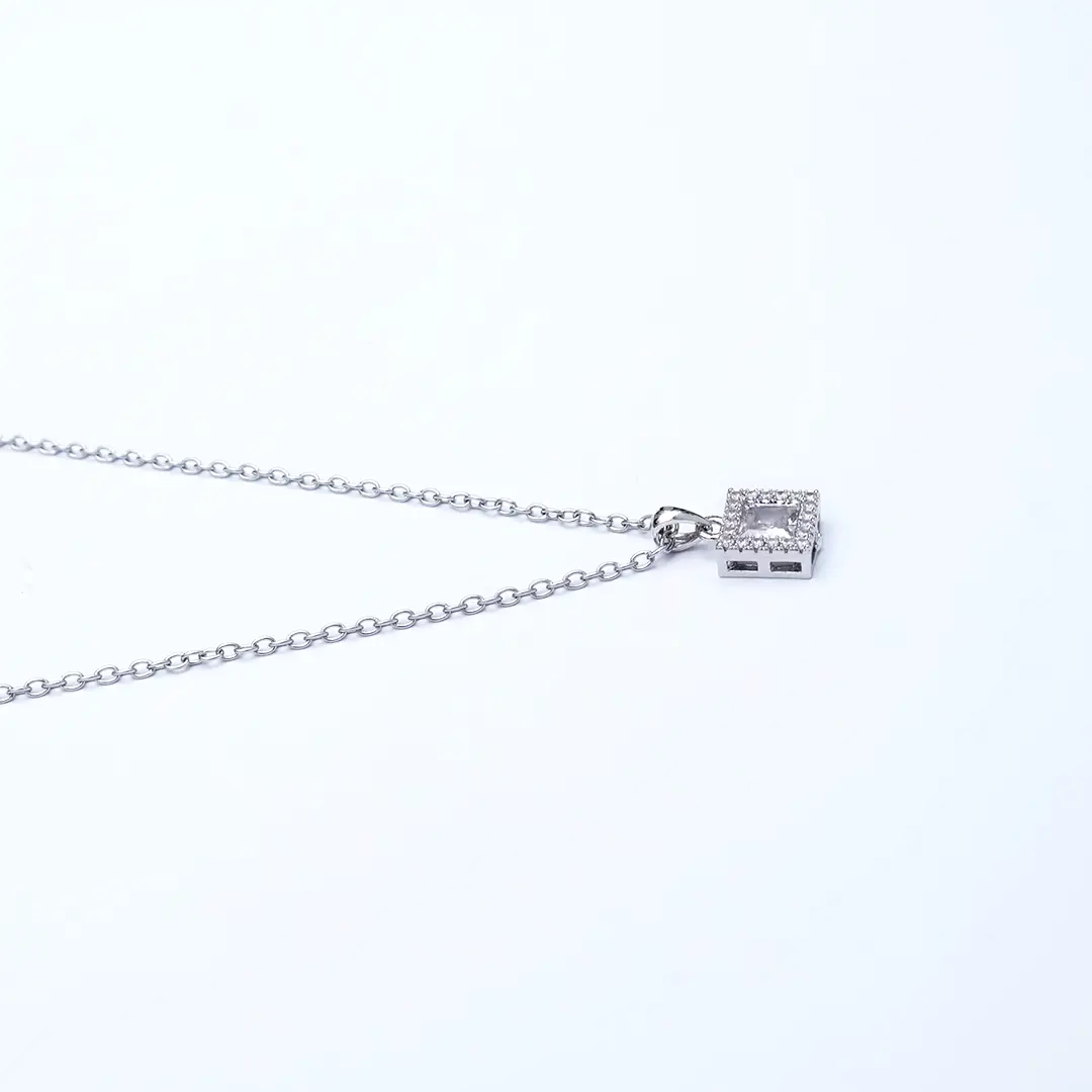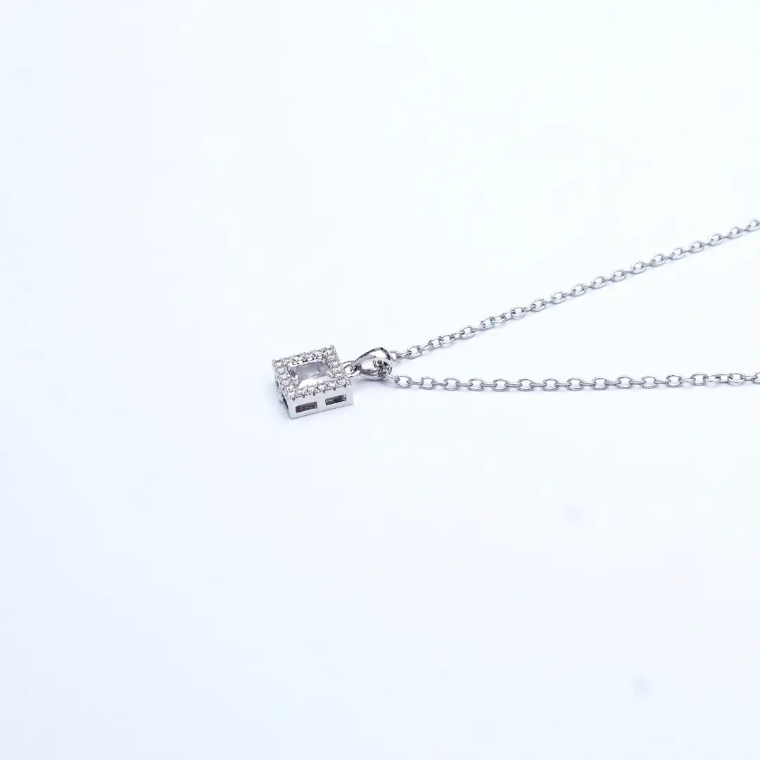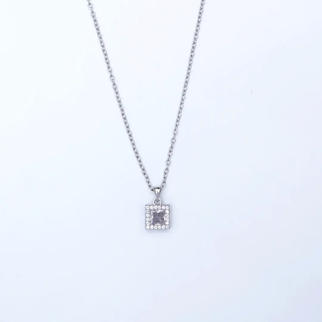 This minimalist silver necklace features a charming square pendant encrusted with sparkling stones that catch the light beautifully. The pendant is framed with a delicate silver border, adding a touch of elegance to the simple design. Perfect for everyday wear or as a subtle accent to a formal outfit, this necklace makes a great addition to any jewelry collection. Its timeless style and understated beauty make it an ideal gift for any occasion.