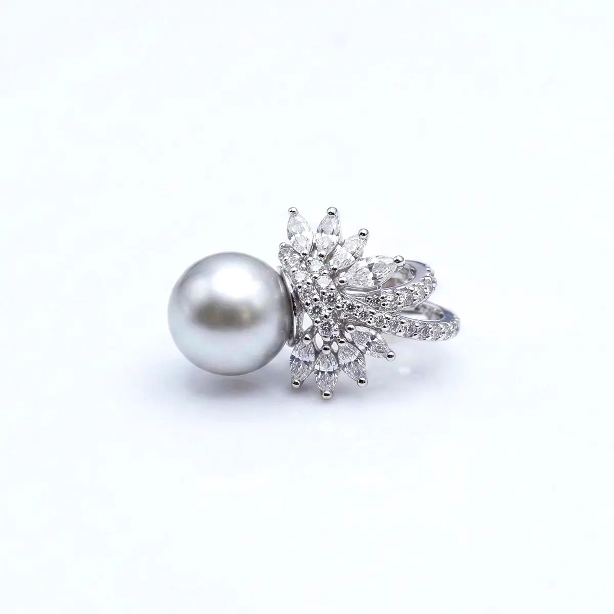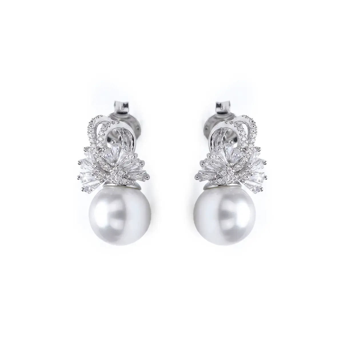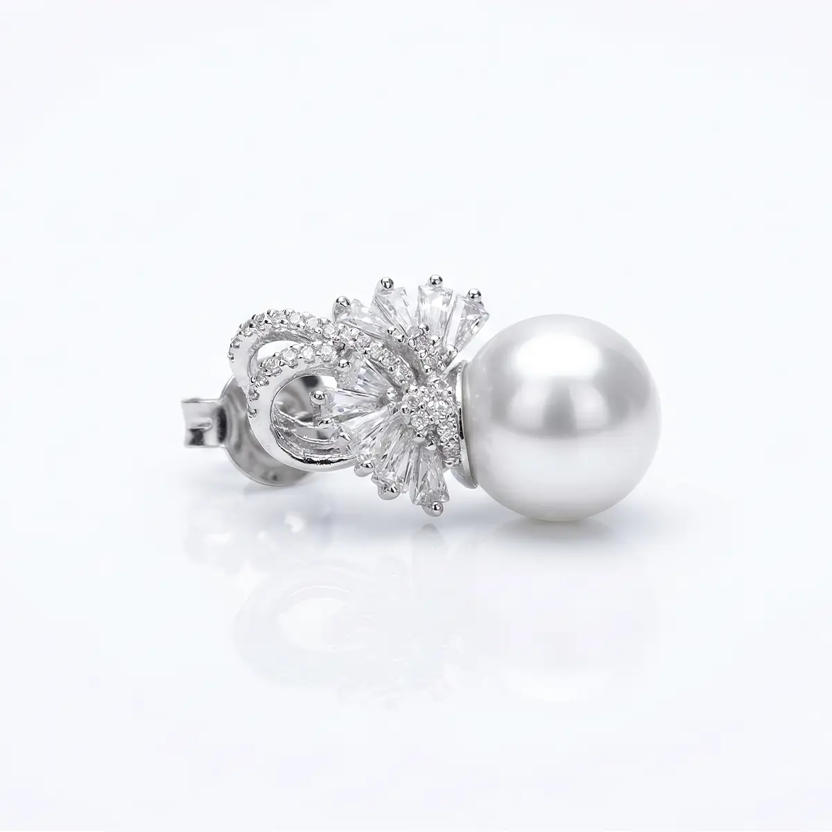 This luxurious earring features a lustrous white pearl at the center, surrounded by intricate diamond-like accents that add a touch of sparkle and sophistication. The beautiful design combines the classic elegance of pearls with the brilliance of the diamonds, making it a perfect statement piece for formal events or special occasions. Set in silver-tone metal, these earrings will elevate any outfit, offering a timeless, refined look.